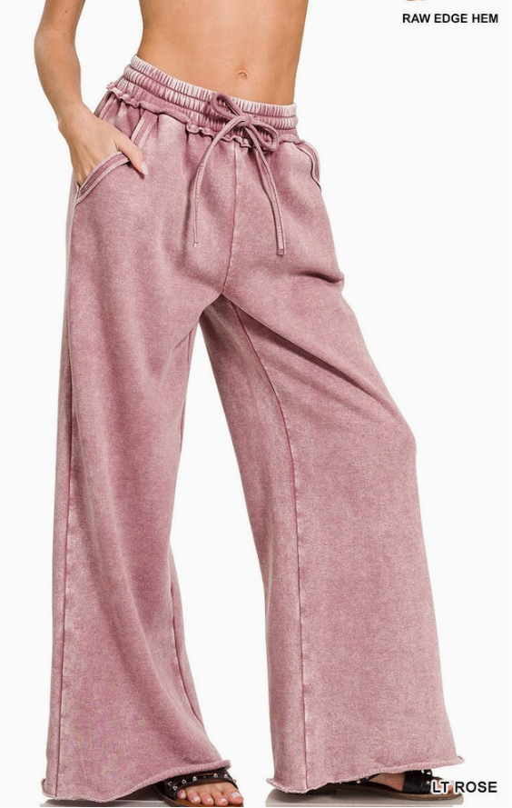 Stay comfortable and stylish in these acid wash fleece palazzo sweatpants. Featuring a drawstring waistband, functional pockets, and a raw hem, they combine casual comfort with on-trend style—perfect for lounging or running errands.